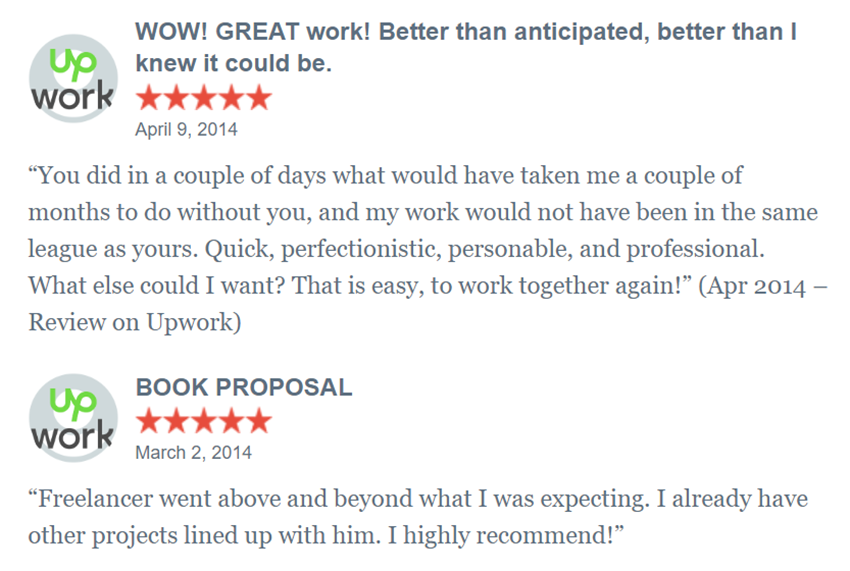 Ghostwriter Reviews, Upwork Freelance Reviews, Collaborator Reviews, Book Reviews, Writing Samples, and More…